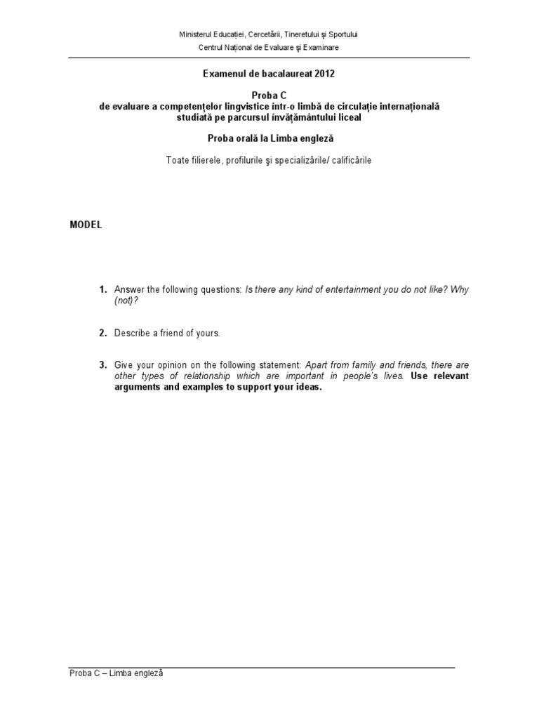 Modele De Subiecte Bacalaureat 2012 Proba C Orala Competente Lingvistice Limba Engleza Pdf