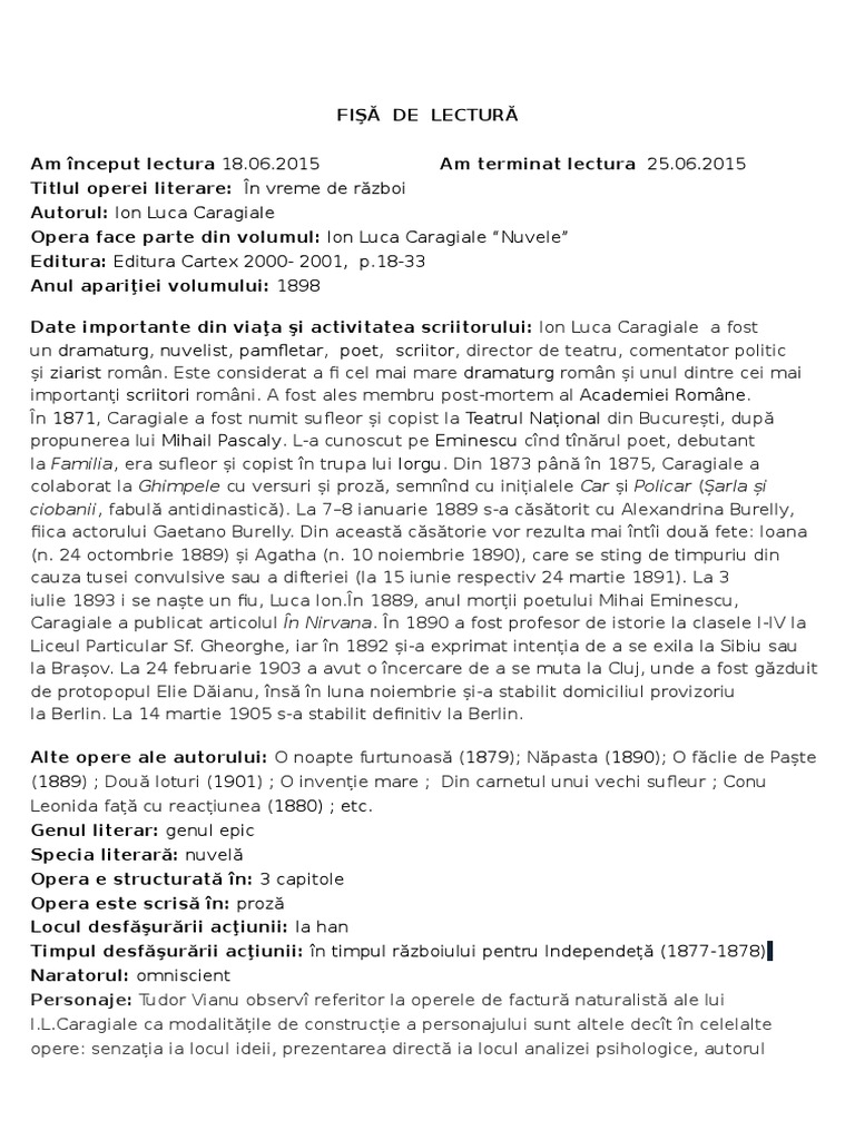 Fisa De Lectura In Vreme De Razboi Docx